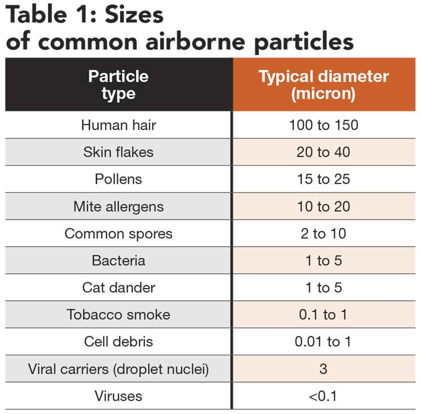 Additionally, the sizes of various airborne particles can vary considerably. See Table 1 for typical sizes of some common airborne particles.