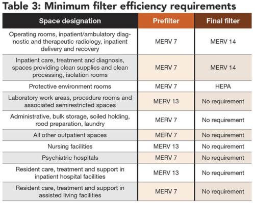 The main code/standard governing required filtration levels in health care facilities is ASHRAE Standard 170: Ventilation of Health Care Facilities. ASHRAE 170 is adopted as code in numerous jurisdictions and compliance with the standard is required for Centers for Medicare and Medicaid Services reimbursements.