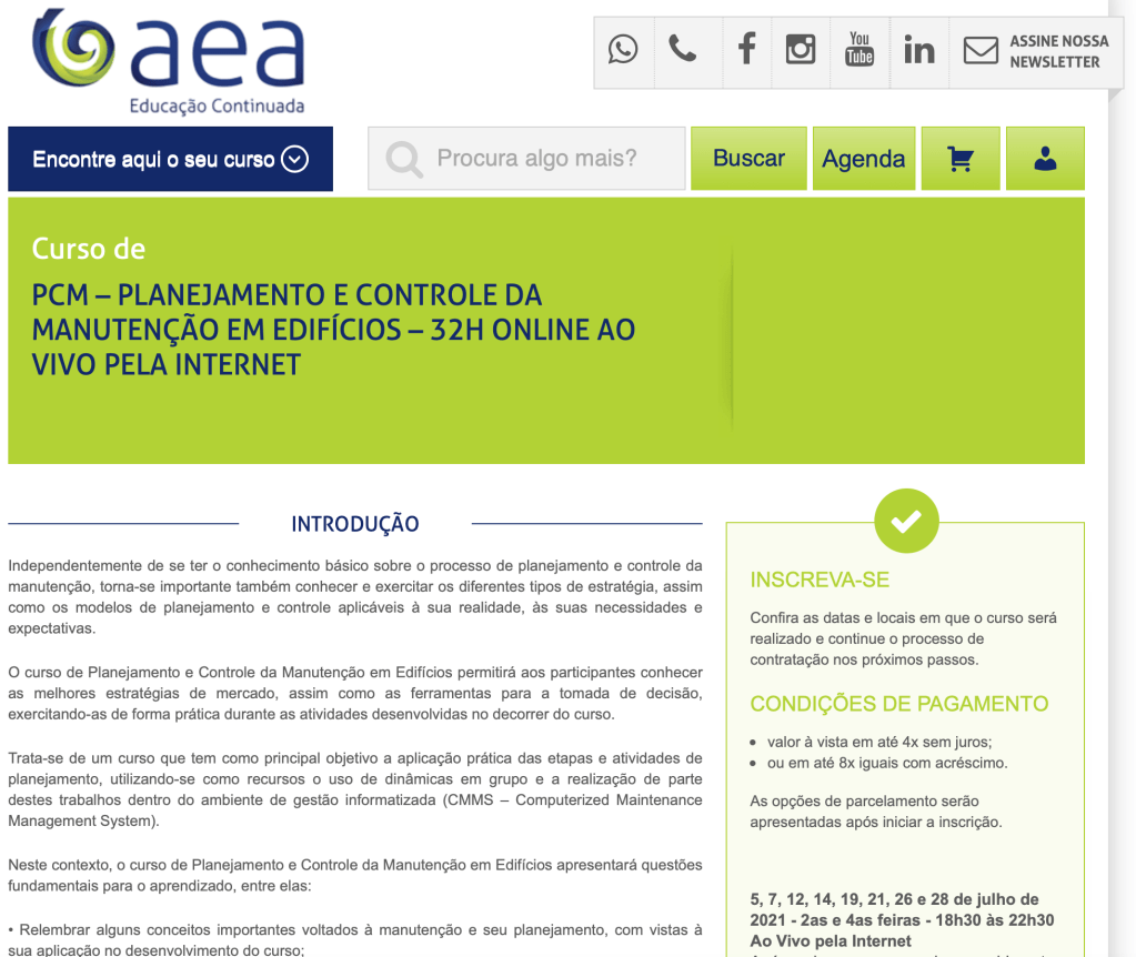 Link da página do curso: https://www.aea.com.br/cursos/curso-de-planejamento-e-controle-da-manutencao-em-edificios