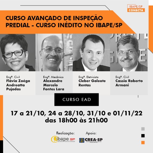 Considerando que estamos em meio a um processo de revisão e maior detalhamento da ABNT NBR 16747 – INSPEÇÃO PREDIAL: Diretrizes, Conceitos, Terminologias e Procedimentos, com a integração dos diversos comitês de estudo da ABNT, o IBAPE SP – Instituto Brasileiro de Avaliações e Perícias do Estado de São Paulo lançou o CURSO AVANÇADO DE INSPEÇÃO PREDIAL, o qual será realizado apenas no modelo EAD, entre os dias 17/10 e 01/11/2022.